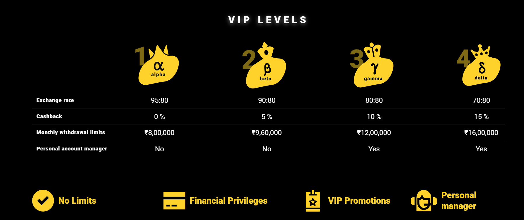 The lowest level is called Alpha. Here, you get a free bonus of Rs. 500 per week. At Beta level, you get a weekly cashback offer of 10%. At Gamma level, you receive 20% cashback. And finally, at Delta level, you get 30% cashback.